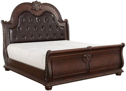 The Cavalier Collection exemplifies the finest in Old World European design inspiration. Egg and dart base moldings, bead molding, and acanthus leaf carvings all blend to achieve an elegant addition for your traditional home. The grand Eastern King sleigh bed features a faux leather, button-tufted headboard insert.Read More