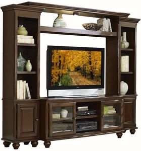 Transitional accents such as bun feet, metal knob hardware and a rich cherry finish lend to the classic look. A lighted bridge highlights the display shelf, each providing support to join the two side unit bookcases. Glass and solid door storage, along with the shelving of the bookcases, provides ample storage for your display accents.