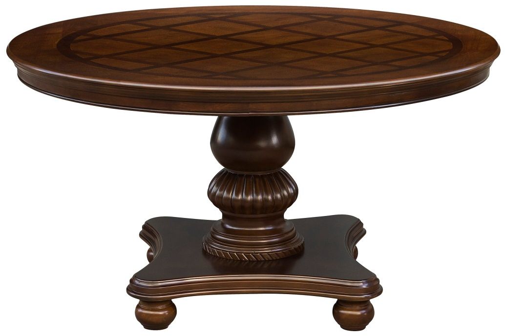Elegantly designed for the traditional dining room is the Lordsburg Collection. Supported by the pedestal base is the table’sround top where the magnificent parquet veneer is highlighted by the brown cherry finish. Heavily carved molding provides distinct accent to the table’s top.Read More