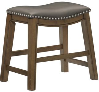 The stool is offered in three heights - 18-inches, 24-inches and 29-inches. The brown finished wood legs and seat apron feature routed accent while the gray faux leather seat features nailhead trim that further defines the stool’s profile. 4 additional seat colors are available – brown, red, green and black – in each stool height.