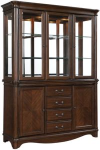 The buffet’s drawer and door storage allow for unseen storage while the glass-fronted hutch puts your favorite pieces on LED-lit display. Cherry veneer is highlighted with a cherry finish solidifying the collection’s classic aesthetic.