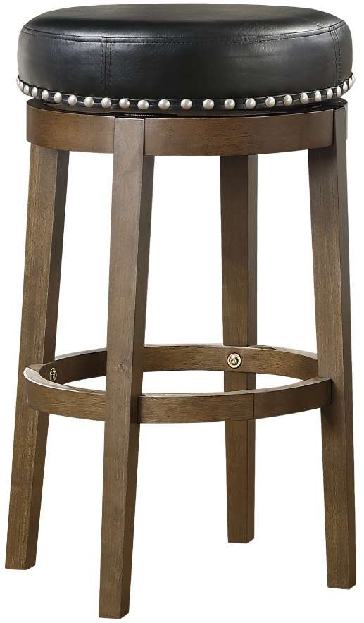 The round, swivel seat, pub height stool is presented at 29-inches. The brown finished wood legs complement the black bi-cast vinyl seat which features nailhead trim that further defines the stool’s round profile.Read More